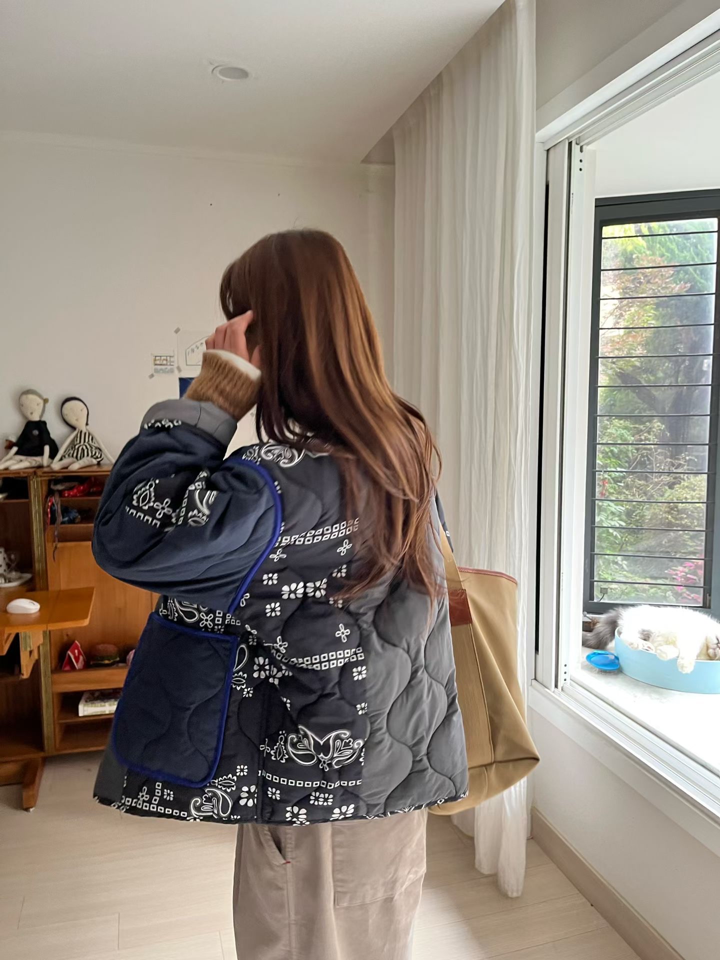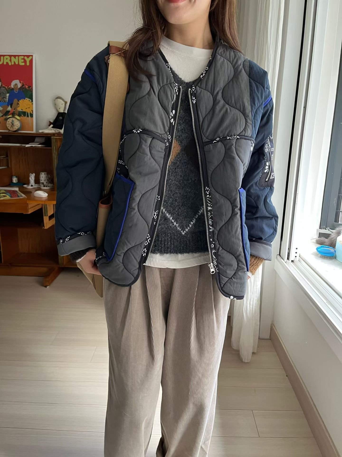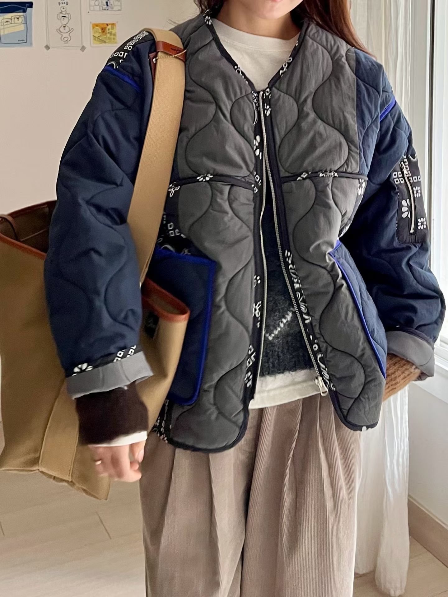 Made in Korea Color : navy 尺寸:F 混紡率:棉100% 拼接設計, 經過絎縫處理,既溫暖又輕便。 尺寸適中,穿著舒適,兩側口袋也很實用 採用拉鍊設計,非常方便 無論搭配在哪裏都很適合穿著 整個季候都可以穿