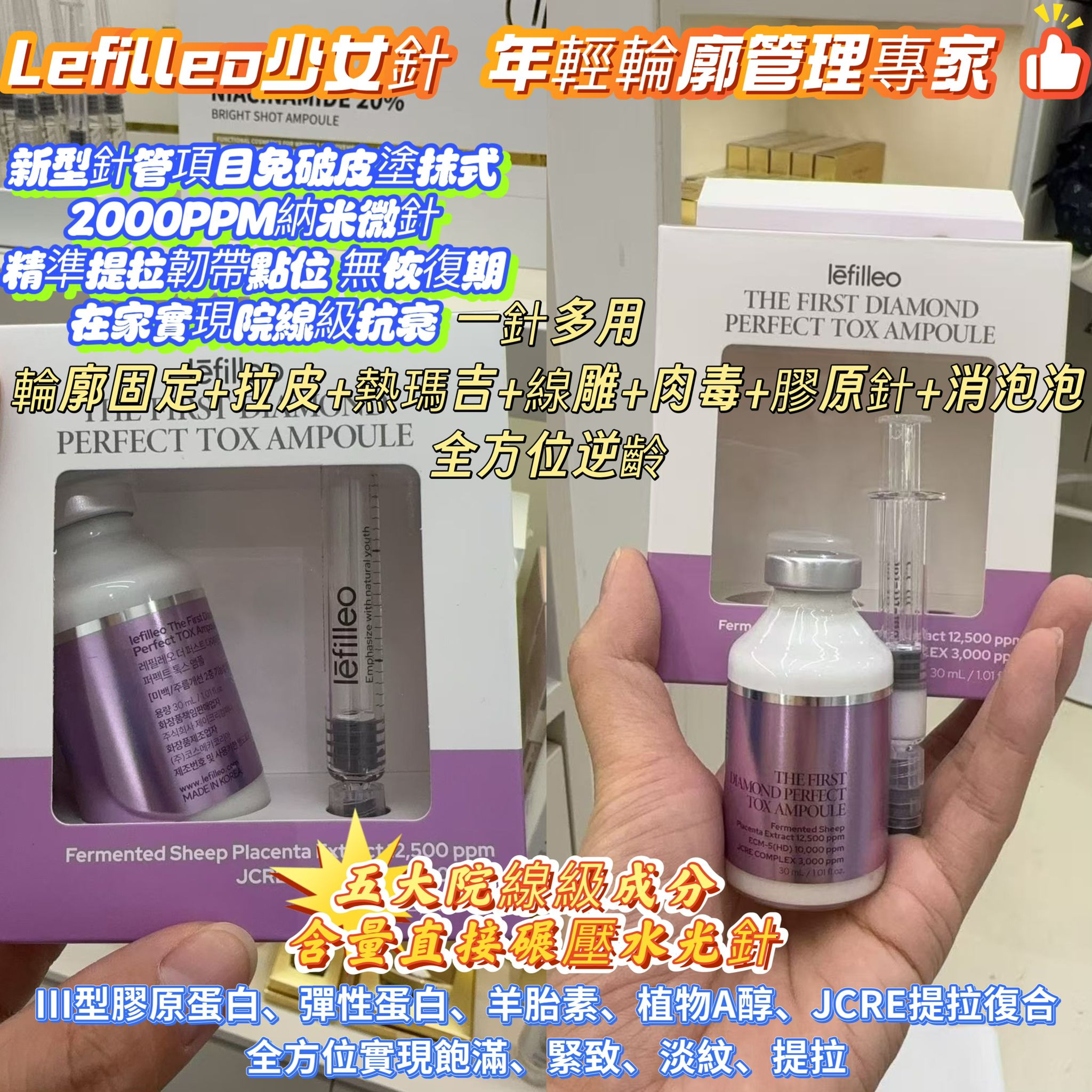 🇰🇷新品全韓首發 🎉 院線級抗老王牌產品|在家實現明星級肌膚管理✨ 🌟 品牌底氣 2017年成立的韓國醫療器械品牌,產品出口全球十餘國,入駐韓國千家院線及樂天、新羅等免稅店,韓國明星貴婦的私藏之選💎 💎 两款精華,各有所長 1️⃣ Lefilleo 麗菲歐嬰兒針精華 🍼 無創get嬰兒Q彈肌 • 核心成分:KLOTHO NAD+抗老因子、jcre complex六肽、白松露、5億牛奶外泌體+20000ppm煙酰胺 • 黑科技:270微米納米微針直達真皮層,滲透力超強 • 效果:28天肌膚年齡下降,膚質回歸Q彈嬰兒肌 2️⃣ Lefilleo 麗菲歐少女針 💉 輪廓年輕化管理神器 • 核心成分:1000PPM III型膠原、10000PPM彈性蛋白、12500PPM羊胎素、10000PPM植物A醇、3000PPM JCRE複合 • 黑科技:2000PPM納米微扎技術,精準提拉韌帶點位 • 效果:1次提升+6.14%,4周深皺-25%、八字紋-21% ✨ 共同優勢 • 無創安全:無需破皮,無恢復期,隨時隨地使用 • 多重功效:緊致、淡紋、亮白、抗老一步到位 • 敏感肌友好:溫和配方,舒緩鎮定,穩定膚況