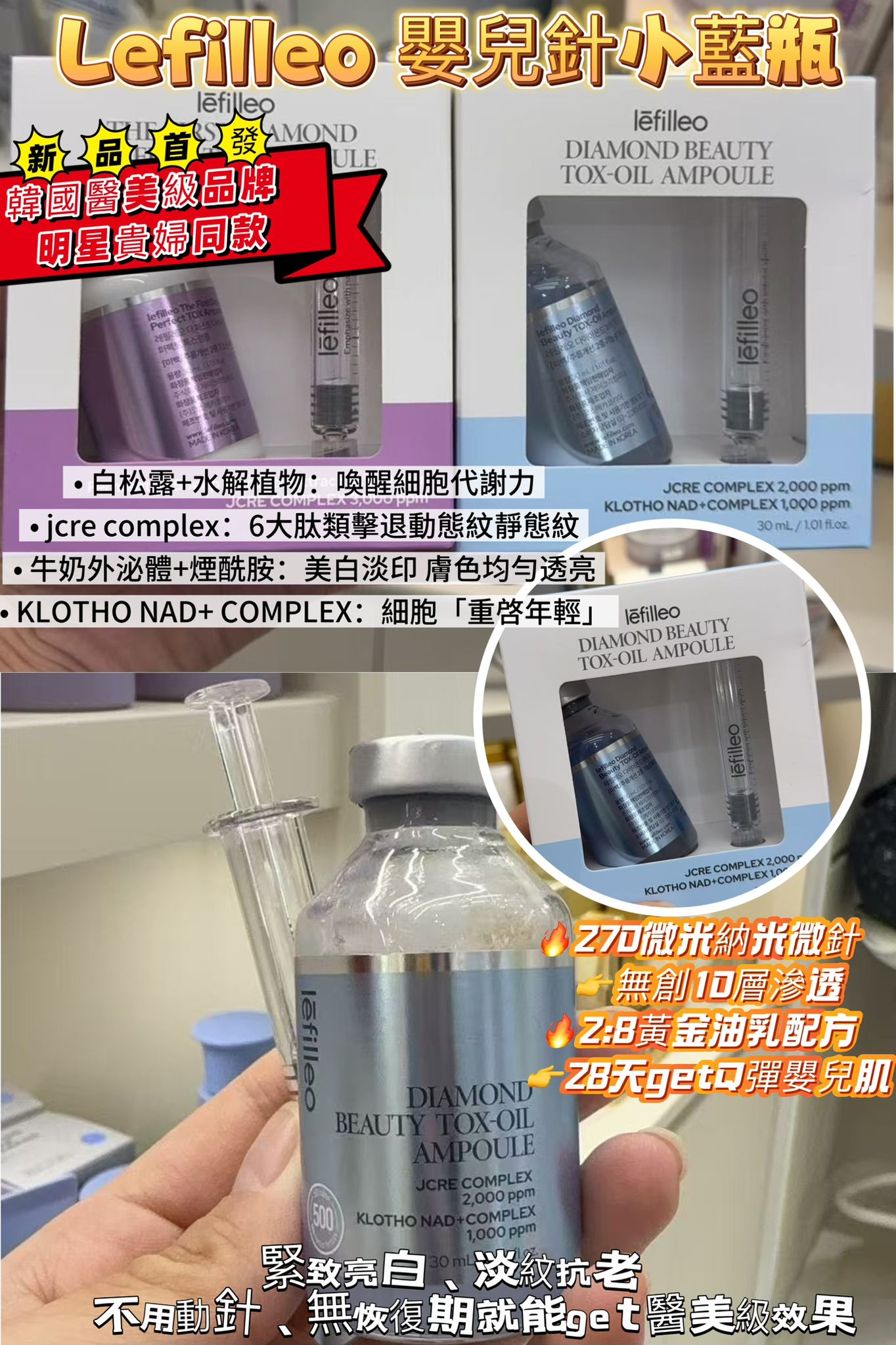 🇰🇷新品全韓首發 🎉 院線級抗老王牌產品|在家實現明星級肌膚管理✨ 🌟 品牌底氣 2017年成立的韓國醫療器械品牌,產品出口全球十餘國,入駐韓國千家院線及樂天、新羅等免稅店,韓國明星貴婦的私藏之選💎 💎 两款精華,各有所長 1️⃣ Lefilleo 麗菲歐嬰兒針精華 🍼 無創get嬰兒Q彈肌 • 核心成分:KLOTHO NAD+抗老因子、jcre complex六肽、白松露、5億牛奶外泌體+20000ppm煙酰胺 • 黑科技:270微米納米微針直達真皮層,滲透力超強 • 效果:28天肌膚年齡下降,膚質回歸Q彈嬰兒肌 2️⃣ Lefilleo 麗菲歐少女針 💉 輪廓年輕化管理神器 • 核心成分:1000PPM III型膠原、10000PPM彈性蛋白、12500PPM羊胎素、10000PPM植物A醇、3000PPM JCRE複合 • 黑科技:2000PPM納米微扎技術,精準提拉韌帶點位 • 效果:1次提升+6.14%,4周深皺-25%、八字紋-21% ✨ 共同優勢 • 無創安全:無需破皮,無恢復期,隨時隨地使用 • 多重功效:緊致、淡紋、亮白、抗老一步到位 • 敏感肌友好:溫和配方,舒緩鎮定,穩定膚況